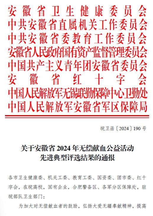 近日,安徽省卫生健康委、省直机关工委、省委教育工委、省国资委、团省委、省红十字会等8家单位联合印发了《关于安徽省 2024 年无偿献血公益活动先进典型评选结果的通报》,我校口腔医学院王天祥同学获“安徽省2024年高校学生无偿献血先进个人”荣誉称号。