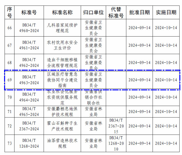 根据安徽省市场监督管理局公告,由我校医学信息学院副院长叶明全教授牵头主持制订的安徽省地方标准《区域医疗智慧急救协同平台建设指南》(DB34/T 4963-2024)于2024年9月14日获批发布,并将于2024年10月14日起正式实施。
