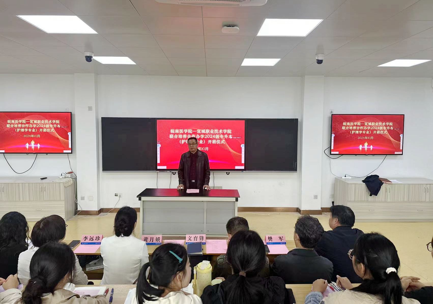 10月16日上午,我校与宣城职业技术学院举办联合培养合作办学2024级专升本护理学专业开班仪式,副院长文育锋、宣城职业技术学院副院长范春申出席开班仪式。仪式在宣城职业技术学院F栋教学楼举行,范春申主持仪式。