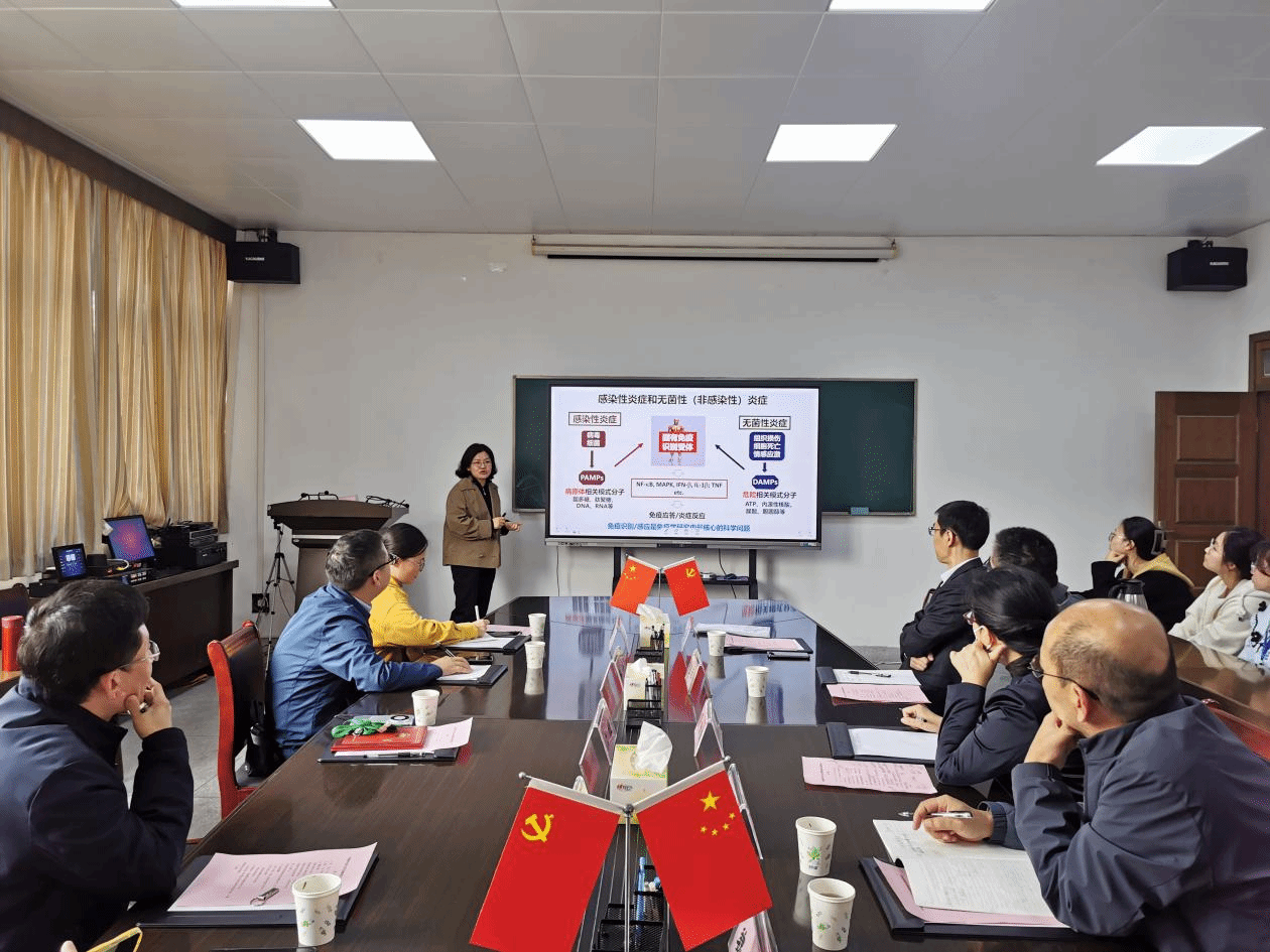 交流期间,基础医学院主要负责同志介绍了基础医学院和医学免疫学学科基本情况。江维教授就其科研团队在《Science》《Cell》《Nature Immunology》上所发表的无菌性炎症发生的免疫学机制、肿瘤免疫治疗的开创性靶点等工作开展情况进行了分享。基础医学院医学免疫学学科青年博士代表介绍了自己当前的科研工作进展情况,并就国家级项目申报的思路和方法与江维教授进行交流,以进一步明确下一步工作方向。