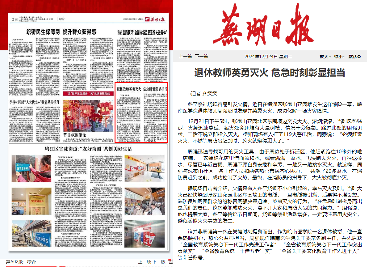 2024年12月24日,《芜湖日报》报道我校关工委常务副主任周强英勇灭火事迹。