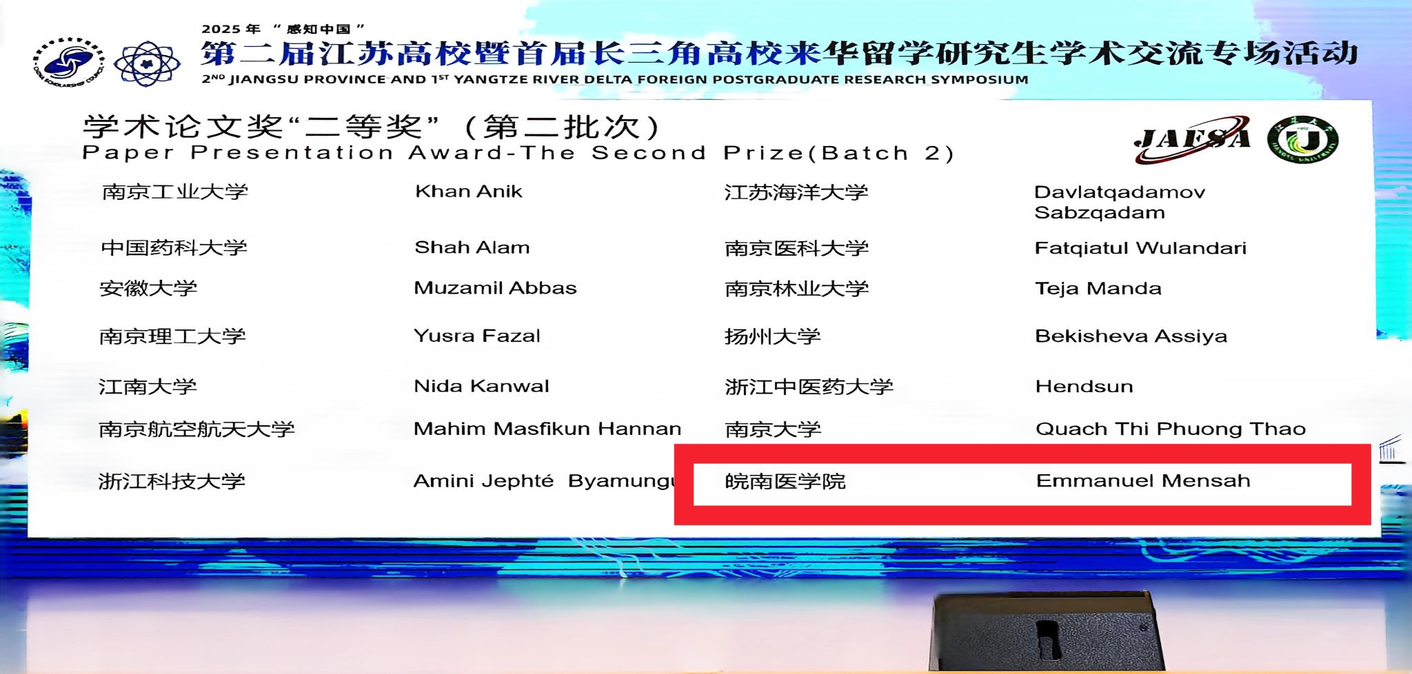 在这场汇聚长三角地区众多高校优秀学子的学术盛宴中,我校国际学生在张文众、査磊和杨竹三位老师的悉心指导下,凭借扎实的学术功底与出色的研究能力赢得评委的充分肯定,2024级公共卫生与预防医学专业永新、2024级临床医学专业思阳、2023级基础医学专业周慕汉分别获一、二、三等奖,充分展现了我校在国际学生培养及学术交流领域的突出成绩。