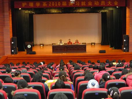 2009年元月1日下午,护理学系2010届实习就业动员大会在大学生活动中心召开。本次会议由护理学系2006级辅导员秦莉主持,全体2006级学生参加。护理学系刘群书记,朱丹主任与会并作重要讲话。