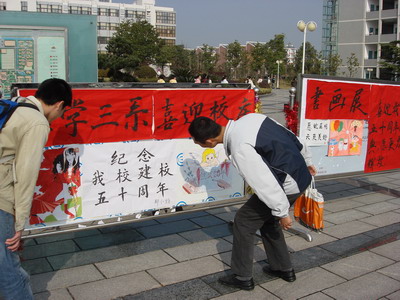 为迎接50周年校庆的到来,11月23日,医学三系团总支学生会在学校教学楼前举办了“医学三系迎校庆书画展”活动。
