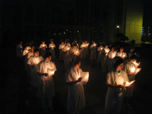 在四川同胞遭受地震灾难的时刻,护理学系2007级(7)班的26名白衣天使于5月15日晚,在风雨操场手持红烛,面朝西方,排成“心”状队形,为四川省地震死难者默哀。他们愿真心能感动苍天、愿爱心能给那些死难者带来一丝慰藉。