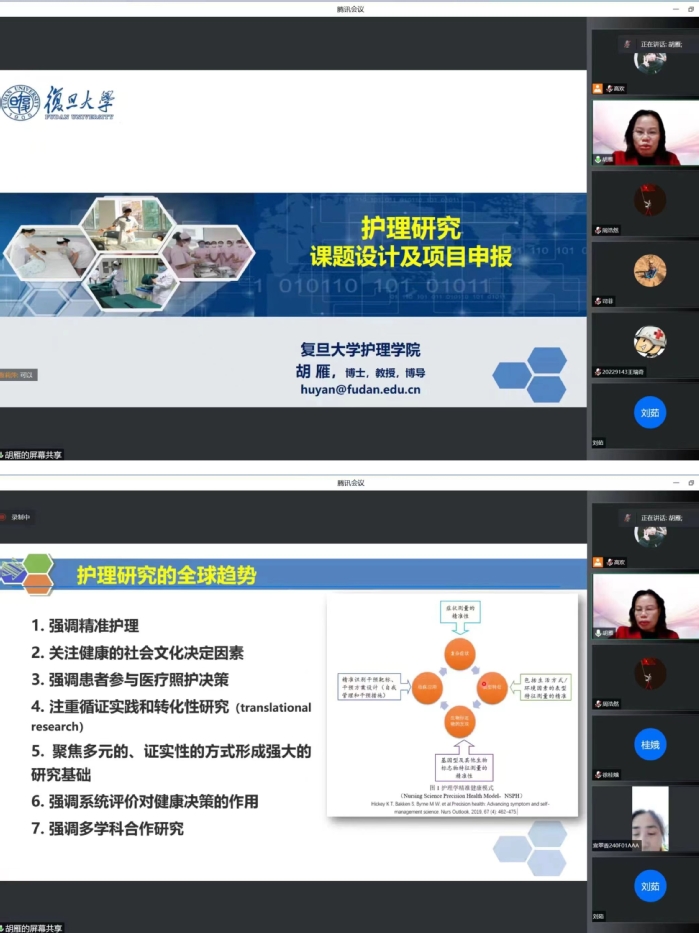 12月16日,护理学院通过线上腾讯会议举办 “青椒加油站” 第五讲,复旦大学护理学院院长、博士生导师胡雁教授受邀作“护理研究课题设计及项目申报”专题报告。学院专兼职教师、教学医院临床教师、联合培养单位教师以及研究生140余人参加。报告会由护理学院院长李远珍主持。