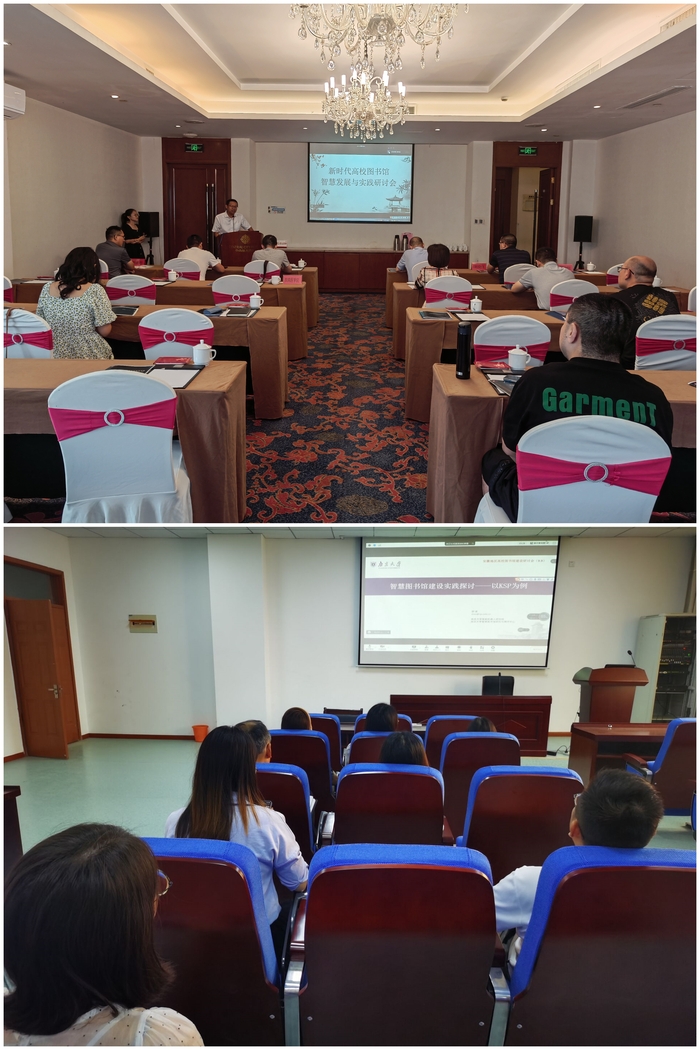 会上,汪全海作代表发言,介绍了我校的办学定位、发展现况和图书馆概况、未来努力方向等。超星集团产品总监宋志森对超星集团在智慧图书馆建设领域的探索、实践以及未来发展趋势进行了总结梳理。超星集团孙欢介绍了超星新一代图书馆服务平台,并就微服务的技术架构、利用大数据思维应对资源建设危机、重塑高效资源采购流程、构建多元化读者阅读体验等智图建设的核心内容进行了交流。南京大学图书馆邵波教授以《智慧图书馆实践与探索——以KSP为例》为题,从智慧图书馆建设背景、从LSP走向SKP的探索、基于KSP图书馆智慧空间、相关实践建设方案及展望出发,从“数智”赋能时代图情档变革谈起,概述了图书馆发展环境变化、图情行业新进展、智慧图书馆发展现状等,并重点介绍了南京大学建设智慧图书馆的核心要素、相关系统等。邵波教授还对青年馆员提出建议,期望有更多青年馆员积极关注并投身到智慧图书馆的建设和使用中来,为图书馆事业的发展提供智力支持和积极力量。