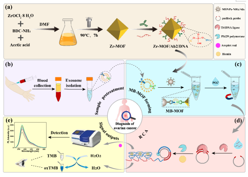 细胞外囊泡(EVs)是肿瘤细胞分泌的纳米级颗粒,携带蛋白质、核酸等特异性生物标志物,被视为癌症“液体活检”的重要靶标。然而,EVs体积小(50-200 nm)、丰度低且成分复杂,传统检测技术存在灵敏度不足、操作繁琐等局限。针对这一难题,研究团队提出了一种基于锆基金属有机框架(Zr-MOF)与级联信号放大的创新策略。具体而言,研究团队通过Zr-MOF纳米颗粒表面修饰的抗体特异性捕获EVs,并通过磷酸盐触发Zr-MOF的降解释放DNA条形码,将EVs的数量转化为可扩增的核酸信号。随后,释放的DNA条形码激活滚环扩增(RCA)反应,生成重复长链DNA并组装形成G-四链体结构。结合血红素后,这些G-四链体作为类酶催化单元,显著放大检测信号(如下图所示)。该平台支持高灵敏度荧光检测与可视化比色分析,结果可交叉验证,适用于实验室精准检测与基层医疗现场快速筛查。该平台在卵巢癌临床样本的检测中表现优异,对EpCAM、CD24等肿瘤标志物的检测灵敏度高达97%以上,能够在5小时内准确区分患者与健康人群,检测限低至每毫升100个EVs。相比传统的超速离心和微流控方法,这一策略无需复杂设备,成本更低,便于在资源有限的医疗环境中推广应用。