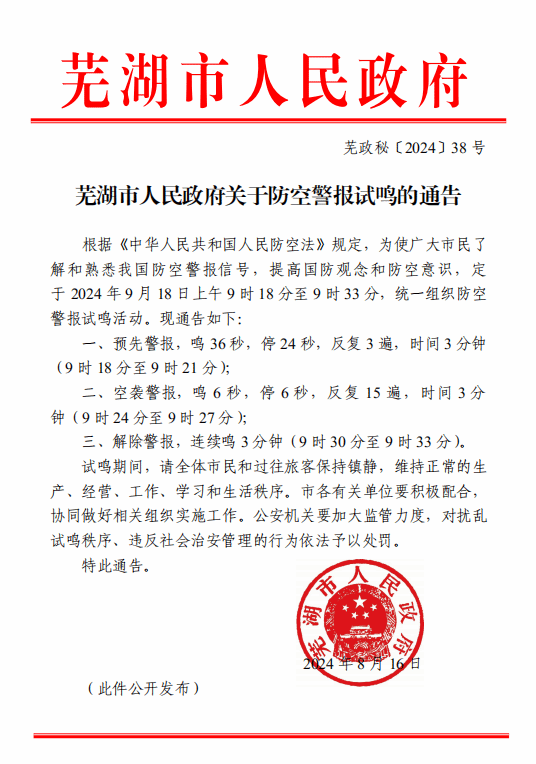 现将《芜湖市人民政府关于防空警报试鸣的通告》(芜政秘〔2024〕38 号)转发给你们,请通过有效形式组织开展学习,了解和熟悉我国防空警报信号的规定。试鸣期间,请全体师生保持平稳心态,维持正常的学习、生活和教学秩序。
